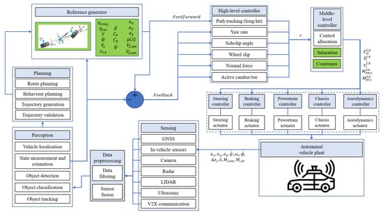 Using a decentralised control structure, it is impossible to realise ICC, as all the controllers work independently. The centralised control structure has only one controller and cannot practically conform to the existing vehicle control system development mode due to (i) lack of modularity, which requires the OEMs to develop the controller together with Tier 1 and Tier 2, (ii) complexity of the controller, (iii) lack of flexibility when additional actuators are needed, and (iv) system failure in case of controller breakdown [,]. This work focuses on coordinated architecture as one of the most perspective ones for ICC implementation. The schematical overall structure of the automated vehicle with integrated chassis control is presented in Figure 2 and contains sensing, data pre-processing, perception, planning, reference generator, and high-level/middle-level/low-level controllers.