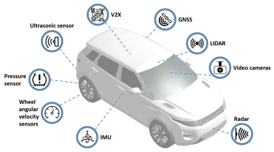 Sensors can be categorised into internal and external state sensors, and passive and dynamic sensors []. Internal state sensors collect information about vehicle state, position, events, and changes. They include in-vehicle sensors and global navigation satellite systems (GNSSs). External state sensors collect information about the environment such as cameras, radio detection and ranging (radar), light detection and ranging (LIDAR), and ultrasonic sensors. These types of sensors can be categorised by transmission range into short, medium, and long-range []. Passive sensors collect external energy and output information such as vision cameras, inertial measurement units (IMUs), and GNSS, while dynamic sensors emit energy and collect responses from the environment such as radars and LIDARs []. It should be noted that sensors often require calibration and recalibration. Cameras require lens distortion calibration [], while IMUs should be calibrated for temperature, bias- [], etc. In addition to sensors, V2X communications potentially provide infrastructure-related and other information during driving, which can be very valuable and enable a high level of convenience that is not possible otherwise [].