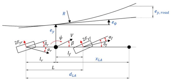 The bicycle model is widely used for different control tasks due to its simplicity. The disadvantages of this model are that the mass, inertia, centre of gravity, and cornering stiffness of the tyres do not change due to load conditions, vehicle velocity, and road type, and this is not accurate in real operational conditions []. We discuss how to overcome the limitations of the bicycle model in the other sections.
