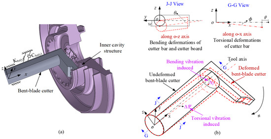 For weakly rigid slender parts, a smart fixture–workpiece system milling error scheme is proposed, which improves the prediction accuracy and reduces the milling error [1]. Urbikain et al. [2] developed a stability model with the Chebyshev collocation method and predicted the chatter straight turning of non-rigid parts. In the frequency domain, a linear stability analysis model for the auxiliary low-frequency vibration during the turning process has been established, along with an analytical stability prediction method for chatter in machining [3]. Khoshdarregi et al. [4] established a new threading model based on the dynamics of the thin-walled shell to research the multipoint thread-turning process of thin-walled oil pipes. Basovich et al. [5] proposed a control methodology for chatter vibration suppression with simultaneous compensation of the machining error in the internal turning process. Akdeniz et al. [6] designed the boring bar with TiNi3 alloy to reduce vibration during turning. In the process of micro-milling and orthogonal turning [7], the flexibility of the cutter is more than that of the workpiece due to a larger overhang. Therefore, the dynamic model of the tool is applied for the prediction the stability lobe diagram. In order to achieve chatter suppression, some scholars consider passive control methods such as tuned mass dampers, nonstandard cutters [8,9,10], adaptive feedback controllers [11], various damping tools [12] and additional devices [13] to enhance the stability of the machining process. All the works mentioned above focus on the turning process analysis of thin-walled cylinder parts and some vibration control strategies of the tool. For the machining of the deep inner cavity with the bent-blade cutter, there is no research yet.
