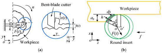 Because of the poor rigidity of the bent-blade cutter, it is easy to produce chatter in the inner cavity structure turning process. As the rigidity of deep inner cavity parts is larger than the cutter, the turning system model of the bent-blade cutter is established considering the vibration of the cutter in the x direction only, as shown in Figure 4a. According to the established model of the bent-blade cutter turning system in Figure 4a, the dynamic governing equation of the cutter can be expressed as follows: