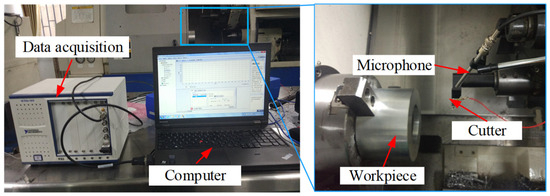 In order to verify the correctness of the prediction model proposed in this paper, a series of standard turning tests and impact tests are conducted on the bent-blade cutter. As shown in Figure 5, the turning tests are carried out in the CNC lathe center (14.9 kW, 4500 rpm). A GRAS 40 pp microphone with a sensitivity of 50 mV/Pa is used to collect the turning sound signals (Holte, Denmark). The tool bar of the bent-blade cutter is fixed on the tool holder, and the overhanging length is 110 mm × 60 mm, which is the same as that of the impact tests. The round blade material is hard alloy, and the blade radius r is 4 mm.