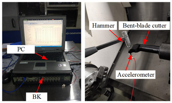 As shown in Figure 6, the impact tests are carried out on the bent-blade cutter. The vibration signal of the tool under the excitation force is measured by an accelerometer with a sensitivity of 98.45 mV/g. Meanwhile, the signal collected is recorded by a B&K data acquisition system. A force hammer (CL-YD-303, Sinocera Piezotronics Inc., Saint Lucia, Australia) with a sensitivity of 4.29 Pc/N is used to exert the hammering force on the bending tool. The obtained frequency response function is shown in Figure 7.