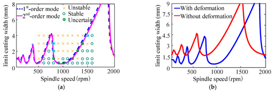 As shown in Figure 9b, the effect of combined bending and torsion deformation on the turning stability of bent-blade cutters is studied using the SLD obtained by the first-order modal parameters. The blue solid line represents the SLD considering the combined bending and torsion deformation effect, and the red solid line represents the SLD without the combined bending and torsion deformation effect. When the effect of combined bending and torsion deformation on the turning stability of the bent-blade cutter is not considered, the stable lobes move up and left. It is obviously different from the stable lobes considering the combined bending and torsion deformation effect. The reason is that the bent-blade cutter is more prone to vibration in the turning process after considering the combined bending and torsion deformation effect, which reduces the machining stability. Therefore, it can be concluded that the combined deformation effect of bending and torsion of the bent-blade cutter in the deep inner cavity part turning process cannot be ignored.