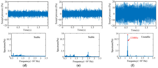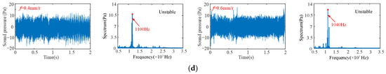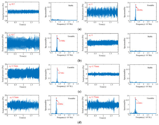 Figure 10 shows the samples of the measured sound pressure signals under different cutting conditions. The spindle speed is 600 rpm and the limit cutting widths are 0.5 mm and 2 mm in Figure 10a,b. The spindle speed is 700 rpm and the limit cutting widths is 3 mm in Figure 11c. The spindle speed is 1400 rpm and the limit cutting widths are 2 mm, 3 mm and 4 mm in Figure 11d–f. The time domain and frequency domain signals of the sound pressure signals are analyzed.