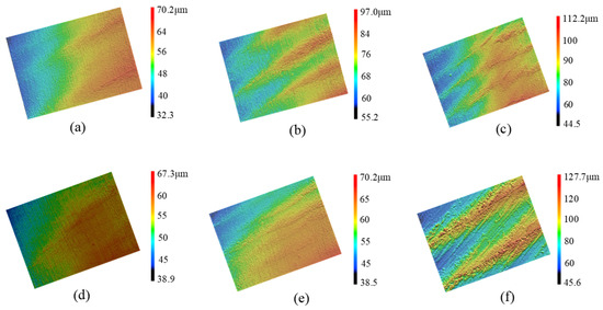 Surface morphology. ((a) n = 600 rpm, b = 0.5 mm; (b) n = 600 rpm, b = 2 mm; (c) n = 700 rpm, b = 3 mm; (d) n = 1400 rpm, b = 2 mm; (e) n = 1400 rpm, b = 3 mm; (f) n = 1400 rpm, b = 4 mm).