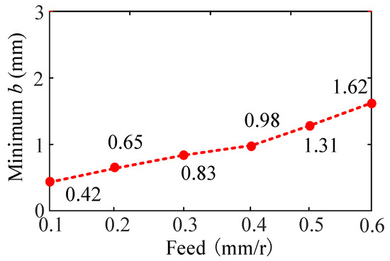 From Figure 12, when other cutting parameters are the same, the stable lobe diagram shifts to left in the direction parallel to the spindle speed with the increase in feed. At the same time, the stable lobe diagram shifts upward, and the minimum value of the limit cutting width increases with the increase in feed, and then, the turning stability of the bent-blade cutter increases, as shown in Figure 13. The reason is that the increase in the feed reduces the overlap coefficient of the two cutting processes and makes the cutting process more stable.