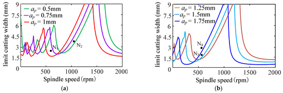 Effect of cutting depth on stability lobe diagram. (a) ap = 0.5~1 mm; (b) ap = 1.25~1.75 mm.