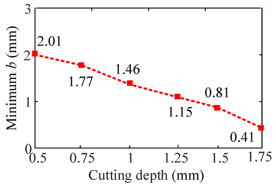 From Figure 15, it can be found that when other cutting parameters are the same, with the increase in cutting depth, the stable lobe diagram shifts to the left and down in the direction parallel to the spindle speed, and the stable region decreases. The minimum value of the limit cutting width decreases with the increase in cutting depth, as shown in Figure 16. Therefore, a smaller cutting depth can be used to reduce the turning vibration in the cutting process of the bent-blade cutter.