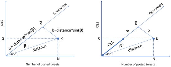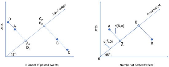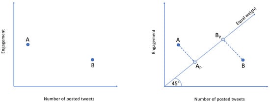 Among the three potential approaches, we have opted for the latter. This involves assigning equal weight to both the number of posts published and the level of engagement achieved. Our decision is grounded in the belief that an opinion leader strives for both visibility and community engagement [12,20]. Consequently, instead of solely focusing on points A and B (as depicted in Figure 1 (left)), we consider their projections on the “equal weight” line, positioned at a 45-degree angle to the X-axis (as illustrated in Figure 1 (right)). The farther the distance from the XY origin, the more favorable the performance.