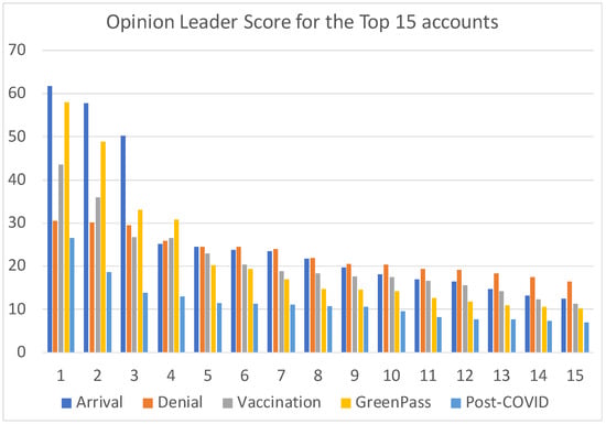 Not all opinion leaders are effective in the same way, as some are able to capture more attention than others. The OLS serves as a valuable metric to quantify this. Figure 4 offers a visual comparison of OLS values among the top 15 opinion leaders in each analyzed dataset. In the arrival dataset, OLS values stood out, signaling that these accounts excelled in engaging users on the discussed topics. However, a shift occurred in the post-COVID dataset, where OLS notably decreased. This suggests that opinion leaders were less effective in community-building around the theme.