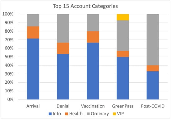 Who are the accounts that emerged as opinion leaders? The answer to this question aids in comprehending the dynamics that characterized conversations in distinct periods and discerning dominant categories. Figure 5 shows the categories of the leading 15 opinion leaders in the analyzed datasets. A noteworthy observation is the shifting prominence of the “Ordinary People” category, which exhibited limited presence within the arrival and vaccination datasets but gained significance in the denial, greenpass, and post-COVID datasets. Despite often having a modest following, these accounts demonstrated a capacity to foster engagement and build community around their posts.