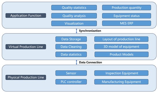 The virtual production line involves the mapping of the physical production line and is connected by real-time data. Real-time data are collected from the production line, including quality data, work order information, production quantity information. These data are stored in the My Structured Query Language (MYSQL) database. Data storage, data cleaning, data optimization, and other functions are then subsequently performed. The virtual production line can analyze historical data and real-time data to obtain optimized parameters, guiding the physical production line to solve quality problems and improve product yield. The virtual line consists of three-dimensional (3D) models with high dimension precision for equipment, layout of production line, and product models. Data storage is highly linked with the digital-twin visual part that realizes data statistics, analysis, and parameters’ optimization.