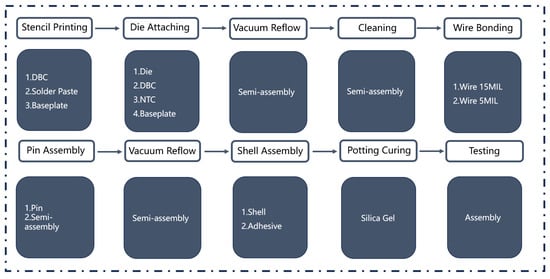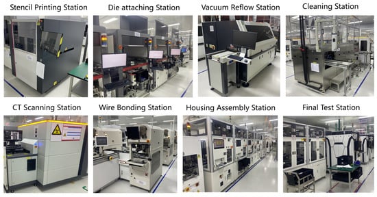 The digital-twin-based IGBT intelligent production line was established in a 400 m2 dust-free workshop. Personnel entering and exiting the facility are required to wear protective clothing and undergo electrostatic treatment. This production line incorporates an advanced packaging process that is compatible with solder paste and solder sheet technologies, enabling lead bonding of various wire diameters and materials, terminal welding, nano silver welding. Additionally, the line facilitates both dynamic and static testing of modules as well as reliability tests such as HTRB, temperature cycling (TC), and high humidity high-temperature reverse bias (H3TRB). Currently in the mass production phase, this production line can manufacture IGBT modules in various packaging forms including ACP (100A, 150A), ACF (300A, 450A), and ACE (900A), which find applications across diverse fields such as photovoltaics and novel energy vehicles for efficient electric energy conversion, as displayed in Figure 17 [].