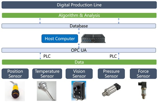 The establishment of an IGBT production line based on the digital twin is crucial for achieving the real-time synchronization between the physical and virtual production lines. Figure 5 illustrates the implementation of data interaction and real-time driving structure in which production line devices with diverse data interfaces transmit multi-source heterogeneous data to the gateway. These data collected from sensors and other sensing devices are subsequently transmitted to PLC and embedded in the host computer through the Process Control Unified Architecture (OPC UA) communication protocol.