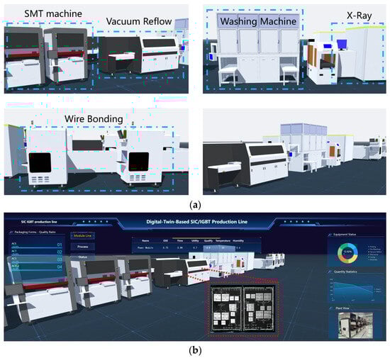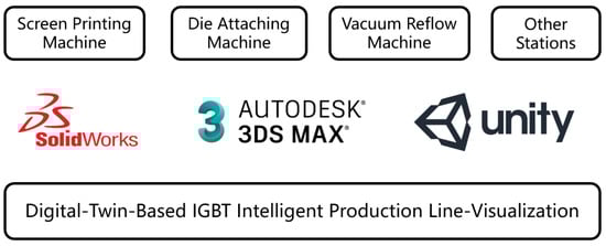 Power electronics have been widely applied in various industries, including electric vehicles and new energy generation []. Among the extensive range of power electronic devices, the insulated-gate bipolar transistor (IGBT) stands out as one of the most commonly utilized ones []. Numerous studies have been conducted to investigate topics related to IGBTs. For instance, Xin et al. proposed a reliable method for measuring the junction temperature of IGBTs in DC circuit breakers []. Wang et al. analyzed the impact of overload current on IGBT bonding wire and module reliability due to shedding []. Yang et al. introduced a data-driven Convolutional Neural Network (CNN)-based approach for classifying different failure modes of IGBT modules under varying PCT conditions []. Through finite element simulation, Fan et al. revealed that bonding lines and solder layers are vulnerable points leading to corrosion in high humidity environments within IGBT module packaging []. Yang et al. presented an innovative method for extracting thermal resistance and thermal capacitance to determine temperatures at critical positions, reducing model establishment time while enhancing practicality and generalization ability []. Furthermore, digital twin technology is gradually being applied in the field of IGBTs. Shi et al. proposed a digital twin-based method for parameter identification of an IGBT component within a three-phase inverter, enabling the separate identification of saturation voltage and forward voltage characteristics, respectively, for reverse parallel diodes []. On the other hand, Li et al. put forth a thermal twin modeling approach aimed at effectively monitoring device temperatures []. Traditional IGBT production lines are generally composed of individual working stations and operations are conducted manually. Integrating digital twin technology into IGBT production could increase production efficiency and product yield. In this paper, a digital-twin-based IGBT intelligent production line is designed and implemented. Various packaging forms of IGBT modules such as ACF, ACP, and ACE are manufactured. This advanced manufacturing system integrates physical components along with their digital counterparts and enables seamless data interaction between them for real-time transmission and analysis across various processes.