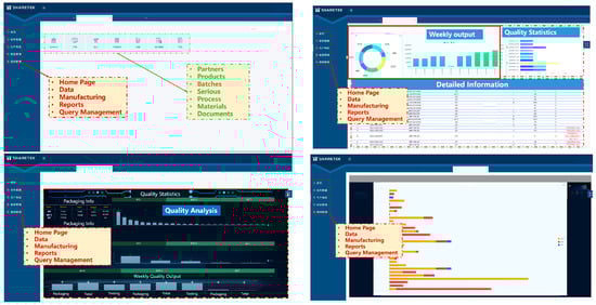 The virtual production line digital model is created using SolidWorks 2022 software, followed by the lightweight processing of the model using 3ds-MAX 2022 software. Subsequently, the processed model is imported into Unity3D to accomplish the layout of the production line as shown in Figure 6. SolidWorks, a widely adopted 3D modeling software, plays a crucial role in the design and manufacturing of various devices and products. Unity3D excels in accomplishing the production line layout and rendering tasks with finesse. Figure 7a displays the digital model of production line equipment and Figure 7b reveals the screen display of the digital production line. A novel production line management and control platform system based on C++ is developed. The platform integrated powerful functions that can display work order completion, equipment status, quality issue statistics, and operation guidance query, among others, in real time, as displayed in Figure 8. Historical data and real-time data are stored in the MYSQL database for data analysis and processing.