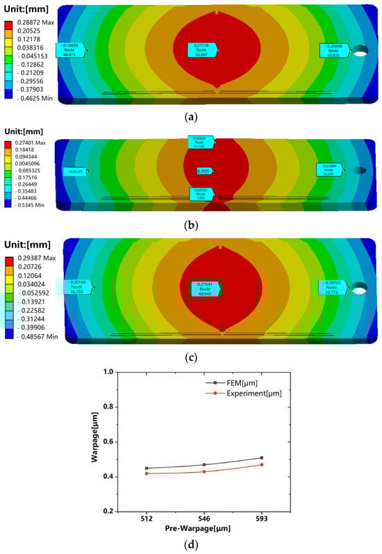 Warpage variation after vacuum reflow with various pre-warpages: (a) 512 μm; (b) 546 μm; (c) 593 μm; (d) Comparison of simulations with experimental results.