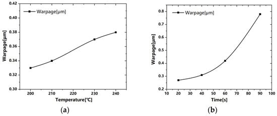Warpage variation with changing parameters: (a) temperature; (b) time.