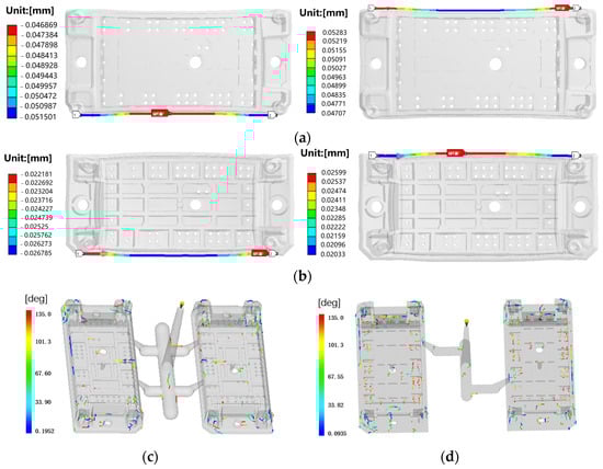 Curing process and injection molding simulation: (a) IGBT housing warpage. variation during heating stage; (b) warpage during cooling stage; (c) weld line positions with two injection positions; (d) weld line positions with one injection position.