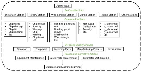 The types and causes of quality issues typically exhibit numerous variations. However, certain correlations and similarities can be observed. Therefore, we propose a digital-twin-based quality problem-solving method that enables the fast resolution of production line quality problems and ensures uninterrupted production. Typically, work orders are used to execute production line operations and contain crucial information such as batch numbers and materials used. This information, including quality-related data, is transmitted from the physical production line to its virtual counterpart in real time. Therefore, an extensive amount of real time and historical quality data are stored within the database. Quality issues are initially classified according to their respective processes, such as die attaching, vacuum reflow, and wire bonding. Each process stores common quality problems based on the database records. Consequently, when a quality problem arises at any station along the production line, it can be promptly identified for subsequent analysis. A fishbone diagram quality analysis method based on the digital twin was proposed to allow for a comprehensive analysis of quality issues from multiple perspectives including operators, working machines, operating parts, operating methods, and environment. The virtual production line enables the real-time acquisition of personnel information in the specific process in which quality problems occur to rule out human error as a cause if the problem persists regardless of the operator or automated station. Subsequently, relevant material information related to the quality issue is examined to determine if it contributes to the problem. If not related to materials, further investigation focuses on abnormal process parameters or changes in the processing sequence. Finally, the system performs an assessment of equipment and environmental conditions including checking for alarm information in the equipment and abnormal ambient temperature and humidity levels. Based on this analysis, the root cause of quality issues or directions for further investigation is provided. Field operators or engineers can use these recommendations to expedite problem analysis and resolution by implementing appropriate measures such as batch part replacements, parameter optimization, equipment repairs, or enhancements in operational techniques. These problem-solving approaches are subsequently integrated into the virtual production line through a combination of database utilization and machine learning techniques. Consequently, when similar problems arise in the future, automated problem-solving measures can be promptly suggested with continuous improvement in accuracy. Commonly used measures include batch part replacements, adjustment of equipment parameters, and optimization of process operations. Furthermore, if quality issues originate from improper processes, simulation data within the virtual production line can facilitate parameter optimization. Figure 14 illustrates the framework of this quality issue analysis method.