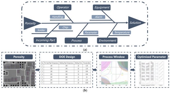 Porosity quality issue solving: (a) Digital-twin-based quality analysis frame. (b) Parameter optimization for the reflow process.