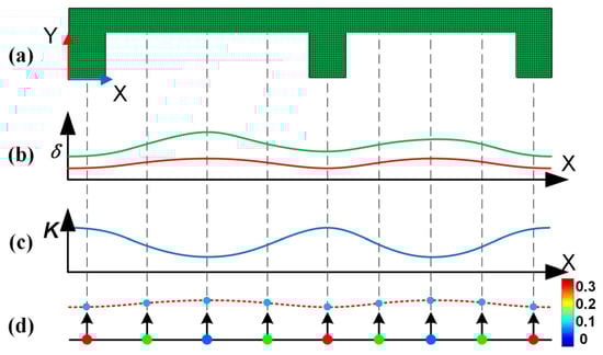 The local stiffness of each position in the thin-walled part varies with the material and local structure of the workpiece in proximity. Within the elastic range of the workpiece, the local stiffness of a specific position on the part is relatively stable. For a smooth and continuous processing area, the local stiffness often varies continuously, wherein the local stiffness variation curve of the part can be established, as shown in Figure 2c. Therefore, the variation of machining errors caused by local stiffness changes is usually continuous. The surface after machining deformation can be represented by the smooth surface reconstructed by the predicted deformed nodes.