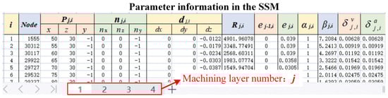The stiffness information of the discrete nodes shown in Figure 2d can be fully expressed in a table. An SSM was built according to the format shown in Figure 3. The second column represents the node number that is used to store the node number information in the FEM software; columns 3–5 store the node coordinate values (x, y, z); columns 6–8 store the node surface vector (nx, ny, nz); columns 9–11 store the node deformation (dx, dy, dz) under the normal force calculated by the simulation software; and column 12 represents the local stiffness of the node positions along the normal direction that is calculated by the deformation and the normal force in simulation.