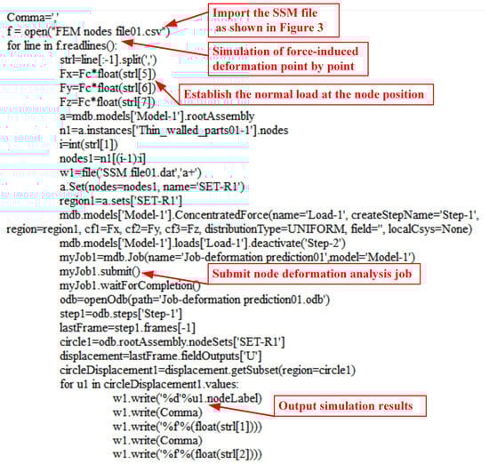 The content of columns 1–12 of the aforementioned SSM model can be automatically calculated and produced through further development of ABAQUS 6.12-1 software in Python. The specific process is shown in Figure 4. First, the machining layers should be determined. For workpieces that require multi-layer machining, an FEM model with multiple machining layers should be established, because it is more convenient to establish the process model of removing material layer by layer in a computer-aided design (CAD) model. Therefore, a FEM model representing the machining process of parts with different residual machining thicknesses was established using several CAD models. Notably, to ensure good SSM accuracy when reconstructing the machined surface, it is necessary to determine whether the deviation es between the surface reconstructed by the node set set(Pi) and the CAD model surface exceeds the maximum deviation limit ɛ when determining the density of the discrete nodes in SSM. If es > ɛ, the node density in SSM should be increased until es ≦ ɛ. After the node set of the machining surface set(Pi) is determined, the node information is sequentially written into the first 5 columns of the SSM file in the format shown in Figure 3. The non-uniform rational B-spline (NURBS) surface was reconstructed using node sets set(Pi), and the surface normal vector ni of each node was calculated from the reconstructed NURBS surfaces and written into columns 6–8 of the SSM. Using the script shown in Figure 5, the same force Fc is applied one by one to the SSM nodes along the normal direction on the part model in ABAQUS. Then, the simulation analysis job is submitted in a cycle, and the force-induced deformation values of each node are extracted and recorded in columns 9–11 of the SSM. Finally, the local stiffness of the node is calculated using Equation (1) and written into column 12 of the SSM.