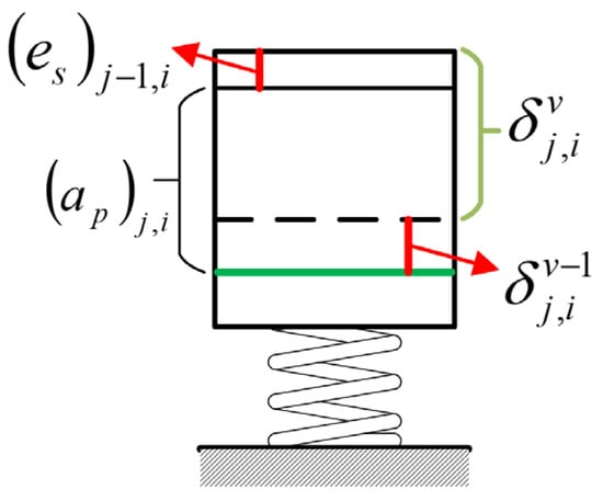 Once the empirical formula is established in the form of Equation (4) through cutting experiments, a predicted cutting force value can be obtained on the basis of a given set of machining parameters. However, the workpiece may be elastically deformed by the cutting force during machining, thereby reducing the actual cutting depth in end milling. This phenomenon, in turn, affects the cutting force. Therefore, force and deformation are in a coupling relationship []. In addition, the residual workpiece material (es)j−1,i of the previous step also affects the actual cutting force and depth.