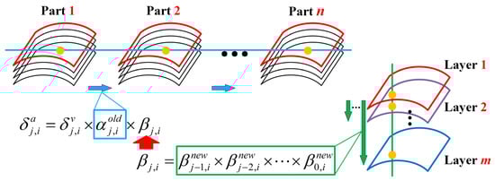 where is the inter-part correction coefficient of the previous part at the current node position (the i-th node in the j-th layer), and is the interlayer correction coefficient that is updated in a layer-by-layer manner with the deepening of the cutting layer. The updating process of in SSM is shown in box 4 in Figure 1. After the calculation of at the current node is completed, the interlayer correction coefficient of the node at the same position in the subsequent unprocessed layer in SSM is also updated. The calculation process is shown in Equation (8), where m is the total number of machining layers.