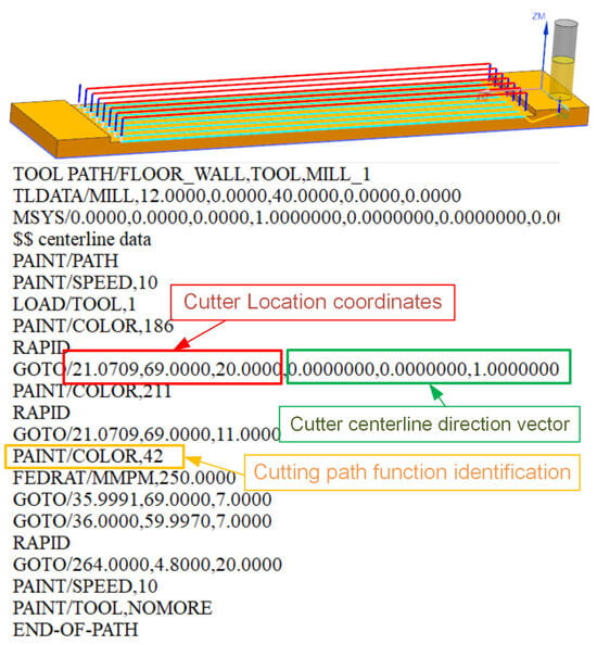In the previous section, we explained the OMM-based iterative correction method for SSM. In this section, we introduce the method for compensation machining according to the corrected deformation prediction results. In this study, the compensation of machining deformation was achieved through the identification and modification of the cutter location source file (CLSF). As shown in Figure 9, the CLSF contains information such as cutter location coordinates, tool centerline direction, and tool path function parameters. During end milling, the tool centerline is always perpendicular to the part surface. Therefore, according to the principle of mirror compensation, for the deformation compensation of the end milling process, we need only translate the cutter location coordinates along the direction of the tool centerline by a distance that is equal to the predicted deformation.