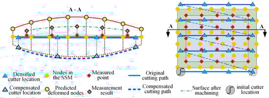However, in the specific error compensation process, the following two points merit special attention: (1) if there is a long straight-line segment trajectory on the tool path, cutter locations should be added according to their corresponding distance; and (2) when calculating cutter location error, error calculation should be performed on the basis of the reconstructed model if the cutter locations do not overlap the measurement points or stiffness nodes.