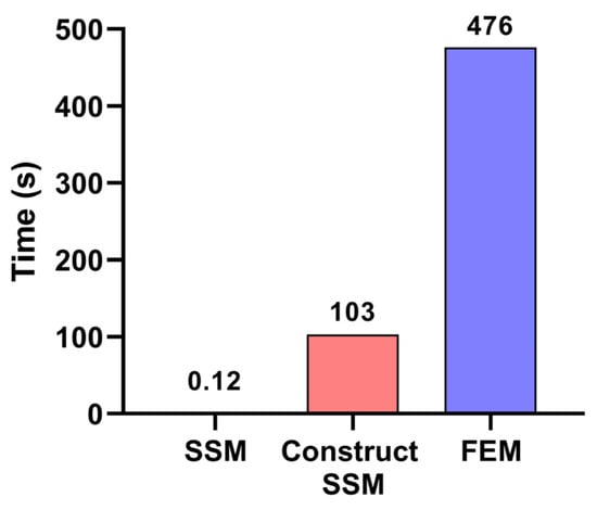 As shown in Figure 15, the deformation prediction process based on SSM only required 0.12 s, despite the 103 s that were required for its establishment. The deformation prediction process based on traditional FEM took approximately 476 s, indicating that the computational efficiency of the traditional FEM is significantly less than that of the proposed SSM-based prediction method. Even if the establishment of SSM is included as part of the SSM-based deformation prediction process, the time consumed by FEM-based deformation prediction is still approximately 4.6 times that of the SSM-based method. This result shows that the proposed SSM method is significantly better than the FEM-based method in terms of computational efficiency.