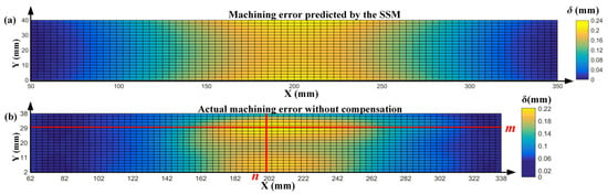 Figure 17a shows the deformation prediction result of the first layer of the part based on SSM, and Figure 17b shows the measured machining error distribution of the first layer after uncompensated machining. From Figure 17a, it can be observed that the predicted part machining deformation errors are symmetrically distributed along the center line, the maximum error occurs at the upper and lower ends of the vertical centerline, and the maximum error is 0.24 mm. Comparing Figure 17b with Figure 17a shows that the overall deformation trend along the length of the part is consistent between the actual measurement and predicted results. They all have small machining errors near the clamping positions on both sides, with the largest machining errors near the middle position. However, comparing specific local details shows that there are several differences between the actual machining and the predicted results. First, the actual machining errors shown in Figure 17b are not symmetrically distributed along the center line. Moreover, on the upper edge of the part, the area where the tool gradually moves away from the workpiece, the actual machining error is significantly smaller, and this area possesses the smallest machining error along the width direction. The maximum machining error along the width direction does not appear at the upper or lower edges of the part but at two positions that are located 10 mm from the edges on both sides.