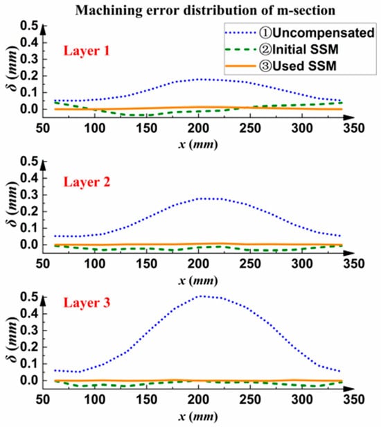 As shown in Figure 18, with the uncompensated machining method, the machining error of the part increased gradually as the cutting layer deepened, and the machining error of the third layer reached close to 0.5 mm. This value is outside the tolerance of the part. The iterative optimization compensation machining method based on the initial SSM had a large error in the machining of the first layer; the maximum error was 0.052 mm. With increasing cutting layer depth, the machining error decreased gradually, and the final error was less than 0.05 mm, which meets the machining accuracy requirements of parts. By using the SSM iterative optimization compensation machining method, the machining error from the first layer to the third layer was maintained within 0.02 mm.