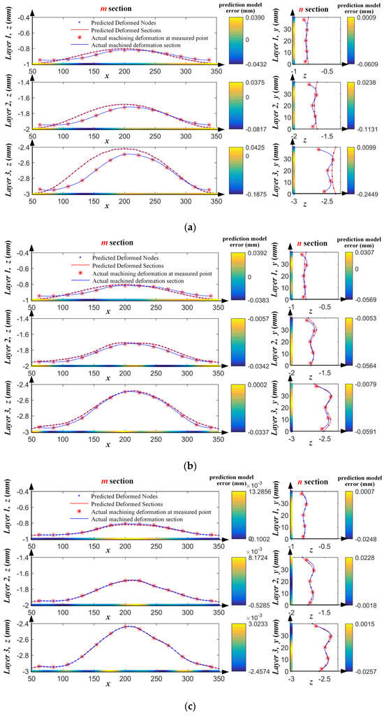 For a detailed comparison of the iterative optimization and compensation effects of each cutting layer in the machining process, cross-sectional curves were adopted to show the error distribution of the prediction model. As shown in Figure 17b, the two sections with the largest actual machining errors along the length and width directions, the m-section line, 10 mm from the upper edge, and the n-section line, where the vertical centerline is located, were chosen as the comparison sections for the machining results.