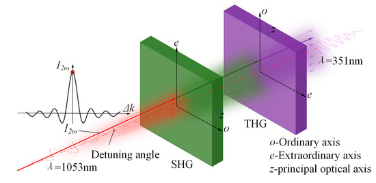 To increase the absorption of laser energy by the target pellet it is necessary to convert the frequency of the laser by employing a frequency converter consisting of a Second Harmonic Generator (SHG) and a Third Harmonic Generator (THG), which converts the wavelength of the laser light from 1053 nm to 351 nm [10]. The large aperture KDP crystals (molecular formula: KH2PO4) are critical in the harmonic conversion process. Due to the unique properties of KDP crystals, the optimal harmonic conversion efficiency of KDP crystals can be achieved only when the incident direction of the laser is at a particular angle to the optical axis of the crystal. At this time, the angle between the crystal’s optical axis and the beam’s wave vector is called the optimal phase matching angle. In order to ensure that the optimal harmonic conversion efficiency can be achieved when the laser is incident on the crystal perpendicularly, the crystal was grown and processed in the direction that the angle between the optical axis and the surface normal is the optimal phase matching angle. However, due to the large aperture requirement of the crystal, as well as the growth and processing errors, the crystal does not reach the optimal phase matching angle. The error of the optical axis deviation from the optimal phase matching angle is called the detuning angle [11,12,13]. The detuning angle will cause the crystal to fail to obtain a better harmonic conversion efficiency. C.E. Barker et al. showed that when the SHG crystal deviates from the optimal phase-matching angle for 40 urad, or the THG crystal deviates from 120 urad, it will lead to a 5% decrease in the conversion efficiency of the harmonically-converted 351 nm beam. The decreasing trend is more and more evident with the increase of the error [14].