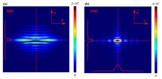 During the offline measurement of crystals, if the harmonic conversion is performed with a collimated beam, the energy of the beam after harmonic conversion is uniformly distributed due to all points in the beam having the same value, so the energy can only be received by energy meters, and the harmonic conversion efficiency curve of the crystal is fitted by changing the crystal attitude, so as to obtain the crystal attitude at the highest efficiency of the harmonic conversion and to calculate the detuning angle. This method takes a long time to measure and has a significant error. As shown in Figure 3, we placed a divergent lens in front of the crystal to increase the beam’s divergence angle. Each component of the divergent beam can separately perform the harmonic conversion in the crystal, and the harmonic conversion efficiency of each component is varied, so that the energy distribution after the crystal in the direction of the e-axis will also have the same change as that of the energy conversion efficiency curve in general. Since the e axis of the second harmonic generation (SHG) crystals and the third harmonic generation (THG) crystals are perpendicular to each other, the direction of change of their energies is spaced 90° apart. We obtained the energy distribution after the crystal by simulation, as shown in Figure 4.
