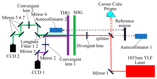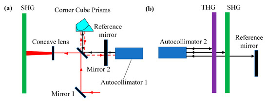 The schematic diagram of the collimation of the crystal is shown in Figure 7b, adjusting the angle of the autocollimator 2 so that the crosshair launched by the autocollimator is perpendicular to the reference mirror, and then adjusting the SHG and THG crystal through the motor so that the crosshairs launched by the autocollimator is reflected back to the autocollimator 2 from the crystals and ensuring that the launched and returned crosshairs are overlapped, which means that the collimation process of the crystal is completed. At this time, the reference mirror and the two crystals are perpendicular to the beam launched by the autocollimator 2, so that it can be known that the crystals are perpendicular to the beam launched by the laser.