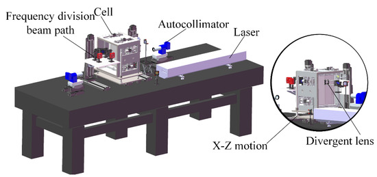 The structure of the MIDC is shown in Figure 6. The device mainly consists of a laser, a harmonic conversion cell, an X-Z motion mechanism, a split-frequency optical path, and a collimation module. The harmonic conversion cell is reserved with loading space for KDP crystals, which facilitates the loading and replacement of KDP crystals. It is also equipped with two sets of pitch-deflection motors to drive the KDP crystal angle for adjustment, and the rotational accuracy of the motors is 1.8urad. A high-precision motorized displacement stage provides the X-Z motion mechanism for X-direction operation, and two guide columns and linear stepping motors provide Z-direction movement. The split-frequency optical path module is an integrated module that receives and separates the mixed-frequency beam emitted from the THG. Optical components, such as long-wavelength pass filters, convergent lenses, and mirrors, are integrated into a cage system to split the mixed-frequency beam and monitor the energy.