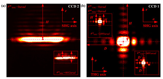 When the MIDC is loaded with only SHG crystal, the harmonic conversion cell can only convert the fundamental frequency beam into the second harmonic beam. Meanwhile, the energy distribution only exists in the CCD2 camera that monitors the second harmonic, as shown in Figure 8a. When two kinds of crystals are loaded in the harmonic conversion cell, the second and third harmonics exist simultaneously after the crystals, and CCD1 and CCD2 can observe the energy distributions of 351 nm and 527 nm beams, respectively. However, due to part of the second-harmonic energy absorbed during the third harmonic conversion of the THG crystal, an amount of the second-harmonic energy is missing in the imaging, and the missing energy corresponds to the higher position of the third harmonic energy distribution. At this time, the imaging in CCD2 is not suitable for the measurement of the detuning angle of the SHG crystal. However, the energy distribution of the third harmonic in the e-axis direction of the SHG crystal in CCD1 is distinct and corresponds to the missing energy of the second harmonic. Therefore, this energy distribution can be used to measure the detuning angle of SHG and THG crystals (Figure 8b).