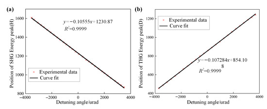 The linear relationship between the crystal detuning angle and the position of the energy peak is shown in Figure 10, and the determination coefficients of the linear relationship fit between the SHG standard crystal and the THG standard crystal are more than 0.9999, with an excellent linear regression. Meanwhile, the errors between each fitting point and the fitting line are shown in Figure 11; the maximum fitting error of the linear relationship for the detuning angle of SHG crystals is 63.3 urad, and the fitting maximum mistake of THG crystals is 95.9 urad. The errors between most of the measurement points at the terminals of the fitting relationship and the fitted relationship are controlled to be less than 50 urad. This means that when the linear relationship is used to measure the detuning angle of the unknown crystals, the measurement error due to the fitting method is controlled between 50 urad.