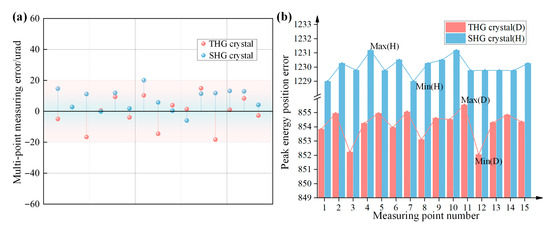 By comparing the detuning angle measurements at each point of the standard crystal with the standard value of this crystal, we obtained the imaging and measurement error interval of MIDC for multi-point measurements of crystal detuning angle, as shown in Figure 12. The detuning angle measurement errors of MIDC are stabilized to be within 20 urad at the full aperture of the same crystal, and the energy peak position hopping errors are within 3.5-pixel points. Therefore, when scanning an unknown crystal at full aperture, if the variation range of the detuning angle of all crystal points is smaller than this error range, we can be sure that MIDC causes the variation.