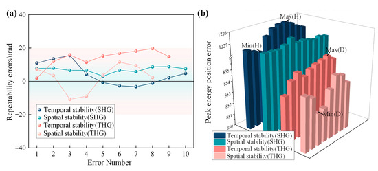 (a) shows the multi-point measurement accuracy of MIDC and (b) shows the energy peak position hopping errors in multi-point measurement.
