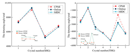 As shown in Figure 14, we took the angle at which the crystals reached the optimal harmonic conversion efficiency in the terminal optics assembly during online commissioning as the reference, and compared the measurement results of the MIDC device with those of the CPMI device. The measurement results show that the maximum measurement errors of MIDC for SHG and THG crystals are 71 urad and 266 urad, respectively. The mean and standard deviation of the measurement errors are 72.78 urad and 75.78 urad, respectively, which is 73% higher than that of the offline measurement system’s previous generation in terms of accuracy and stability. Therefore, after the offline measurement of the crystal, we only need to tune the crystal online 1–2 times to obtain a high harmonic conversion efficiency.