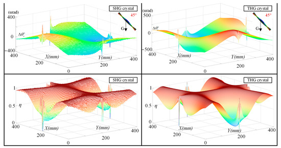 Under the conditions affected by gravity, we simulated and analyzed the deformation of the crystals using a four-point clamping scheme. SHG crystals (410 × 410 × 12 mm) and THG crystals (410 × 410 × 9 mm) were modeled separately under the condition that the surface normals differed from the direction of gravity by 45°, and fixed constraints were applied in the middle of the four sides of the upper and lower surfaces of the crystals. After obtaining the face shape variations matrix of the crystals, we calculated the variation values of the detuning angle and the relative conversion efficiency of the crystals by Equations (3) and (8)–(11), respectively. As shown in Figure 15, under the condition of 45° tilt, the SHG crystal varies within ±400 urad of its detuning angle due to the effect of gravitational deformation, and the THG crystal goes within ±380 urad. We bring the relative harmonic conversion efficiency and detuning angle error matrix into Equation (12) to obtain the detuning angle measurements that need to be optimized for the crystal under the influence of gravity. The theoretically optimized value for the SHG crystal tilted at 45° is −0.2868 urad, and 0.031 urad for the THG crystal.