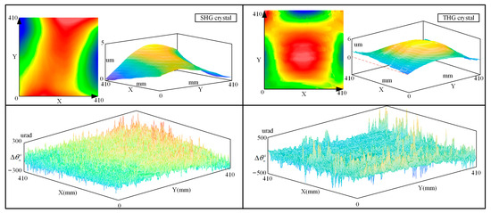 The actual crystals also have deformation from other factors, such as clamping force in the process of gravity. We use the interferometer to scan the face shape of several unknown crystals under gravity conditions, and the value of the change of their detuning angle is calculated. As shown in Figure 16, we scan the face shape of an unknown SHG crystal and a THG crystal, respectively, and calculate the change of detuning angle at each point. After calculating Equation (12), we determined the optimized detuning angle error values under gravity for these two crystals as 11.59 urad and −3.5077 urad, respectively.