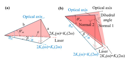 When the crystal is rotated around the e-axis, the variation of θ is shown in Figure 17. Since the SHG crystal adopts type I harmonic conversion (o + o = e), the refractive index of the beam incident into the crystal is consistent in all directions. As shown in Figure 18a, when the deflection angle of the SHG crystal around the e-axis is α, and the refractive angle of the beam is β, the relationship between θ and α, β, and θm at this time can be found by Equation (13):
