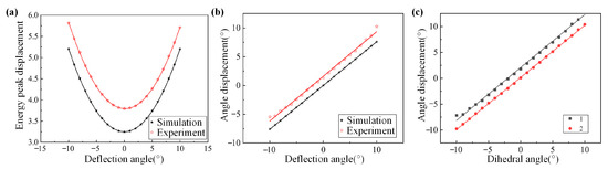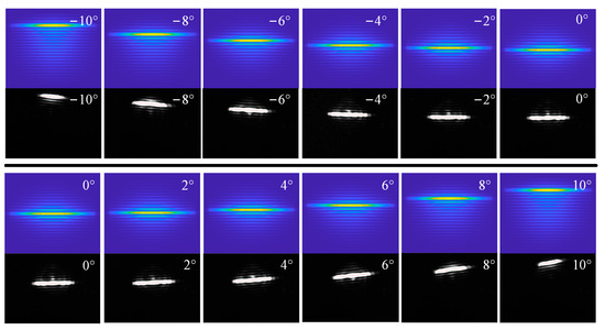 We carried out theoretical simulation and experimental verification of the energy distribution of the crystal deflection angle α in the range of ±10° transformation, where α = 0° is taken when the crystal surface is found to be parallel to the laser and the clockwise direction is the positive direction. The experimental images and experimental results are shown in Figure 19 and Figure 20a, respectively. It can be seen that the energy distribution changes when α varies uniformly at ±10°. We used a quadratic function to fit the simulation and experimental results and obtained a high fitting coefficient. When the positioning error of the crystal in the direction of deflection around the e-axis is controlled within ±0.3423°, the measurement error of the detuning angle caused by it can be controlled within ±5 urad.